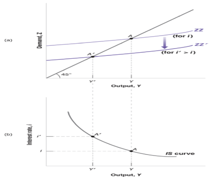 An increase in reduces investment, shifting down to and lowering output from to . Mapping these pairs into panel (b) traces out the downward-sloping IS curve.