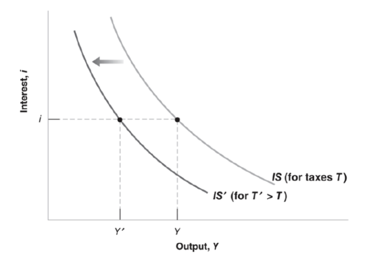 Higher reduces consumption, shifting demand from down to . Equilibrium output falls from to . This happens for any given level of , so the entire IS curve shifts left.