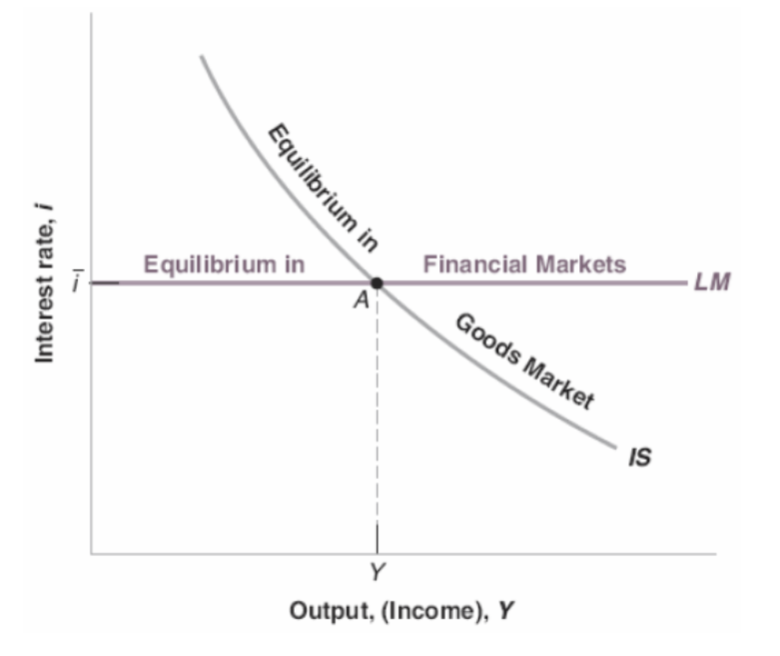 Combines the goods market (IS) and financial markets (LM) to jointly determine output and interest rate in the short run. The IS curve is downward-sloping because higher reduces investment and output; LM is horizontal at the central bankβs chosen . Fiscal policy shifts IS, monetary policy shifts LM, and the two can be mixed to target different combinations of output and interest rate. At the zero lower bound, monetary policy loses traction (liquidity trap) and fiscal policy must step in.