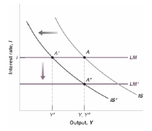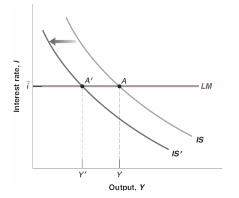 An increase in (or decrease in ) shifts IS left to . The economy moves from to along the LM curve: output falls from to while stays fixed.