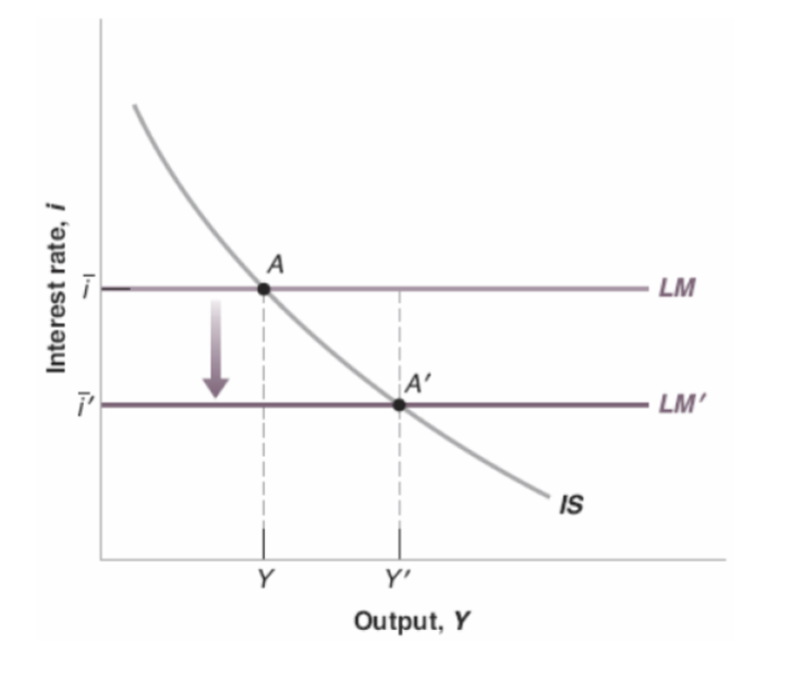 The central bank lowers to , shifting LM down to . The economy moves from to along the IS curve: output rises from to .