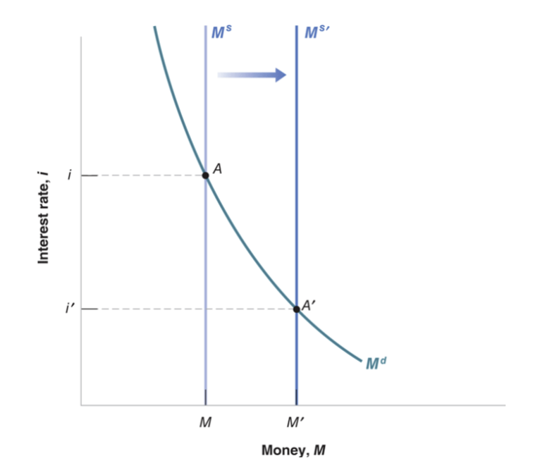 To lower to , the central bank increases money supply from to . Along the money demand curve , equilibrium moves from to .