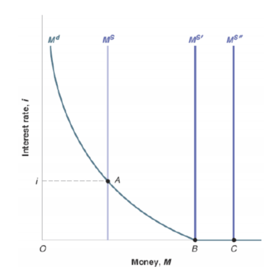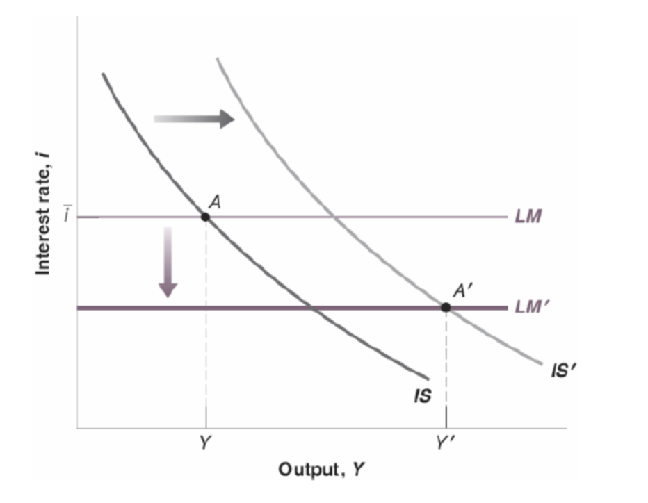 When is near zero, becomes flat β people are indifferent between money and bonds (see liquidity trap). Increasing to or just moves along the flat portion (points , ) without lowering . Monetary policy is ineffective, so fiscal policy must be used instead.