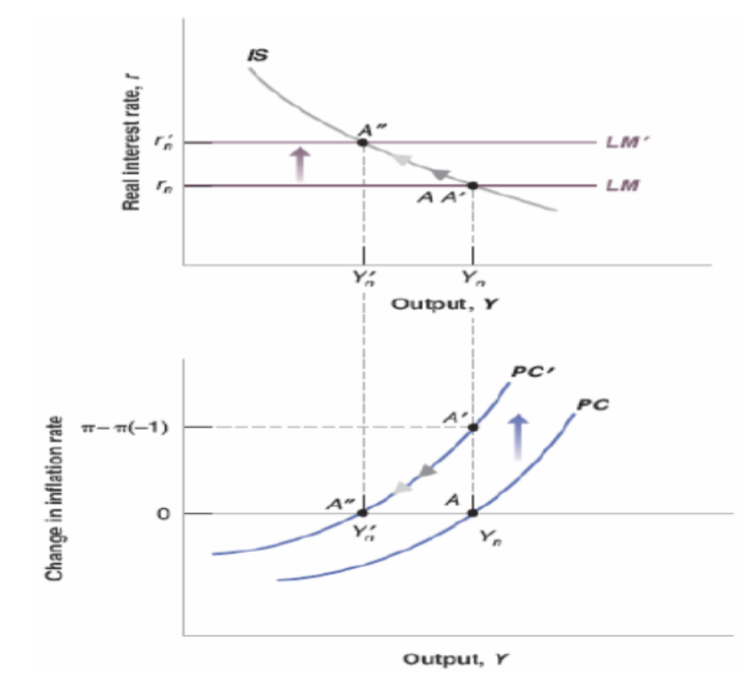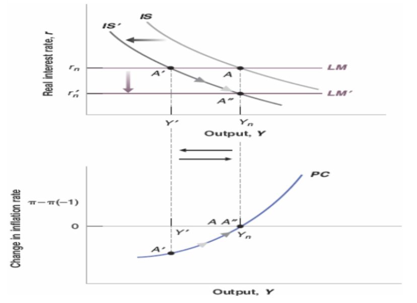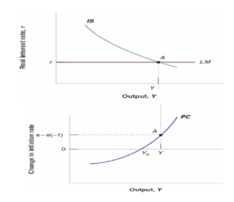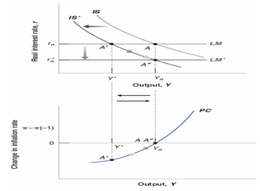 Integrates The IS-LM Model with the Phillips Curve into a unified framework. In the short run, IS-LM logic determines output; over time, the PC pulls the economy toward through inflation dynamics. Anchored expectations allow painless adjustment; de-anchored expectations require a recession. The zero lower bound can cause deflationary spirals, and oil shocks produce stagflation by shifting .
