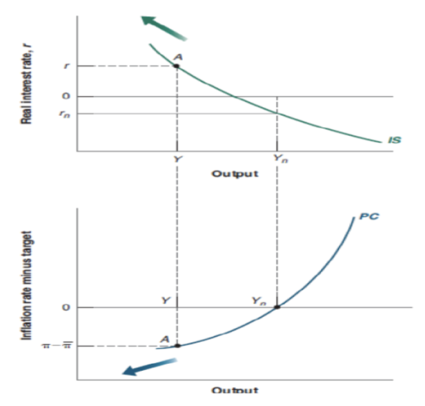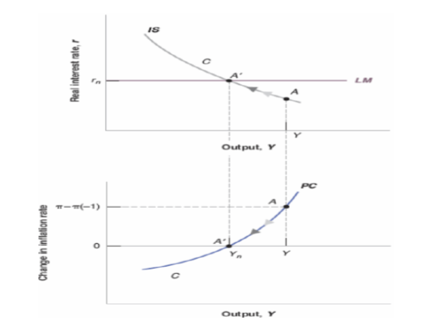 In the medium run, the economy settles at and . The real interest rate that achieves this is the natural rate of interest , defined as the rate consistent with in the IS relation.