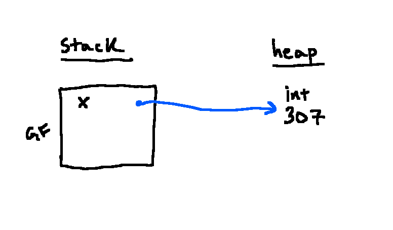 Python works sequentially, so we start with x=307, where = is called the assignment statement, performed by evaluating the right side of the equals sign and then associating that with what’s on the left. We first store our integer on the heap: