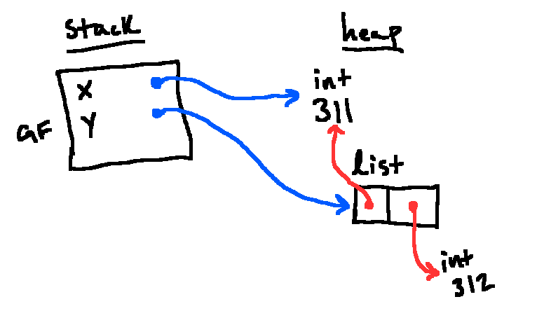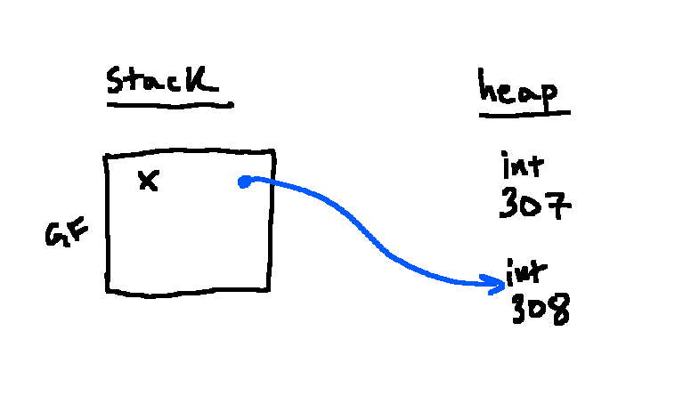 In the third line, will y point to a new instance of 308 in the heap or the same one?