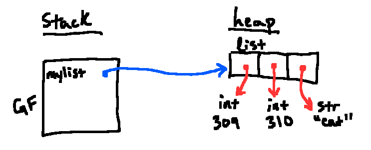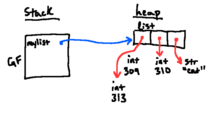 Importantly, when Python makes a list, the contents (items) are stored as references to other objects, not objects themselves. In the example above, Python sees a literal representation of a list with 3 elements. When we get a new list object, the references in that list point to the results of the subexpressions, namely 309, 310, "cat". Since each is a literal expression, we can evaluate each one to give a new object on the heap.